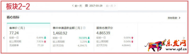 板塊2默認顯示的是店鋪前一天的核心數據,包括訪客數、瀏覽量、支付金額、支付轉化率、客單價、售中申請退款金額、以及店鋪服務態度評分。這個板塊的數據默認可以看三個月內的任一天,只要選擇板塊上面的日期就可以看到。通常這個板塊我們也是根據數據波動,進行店鋪運營策略調整,如果數據異常,我們就會深入的查找原因進行策略調整。