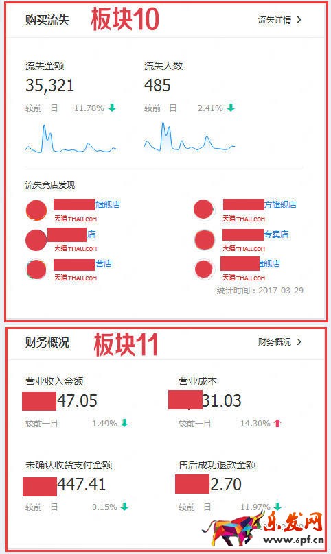 繼續往下拉,進入板塊10-11,可以看到購買流失板塊,即所有瀏覽過我們店鋪但是沒有在我們店鋪下單的人,到了其他店鋪下單的金額和流失的訪客人數,在下面還列出了訪客購買的店鋪,也就是我們的競爭對手的店鋪排行。