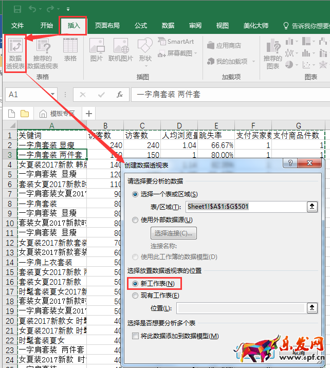 下一步,做數據透視表合并7天的數據。首先在Excel表里插入-數據透視表,注意鼠標一定要點在有數據的地方不能點空白的單元格,否則就會沒用。