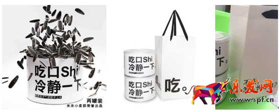 手提袋上的文案也挺有意思,一面是個“吃”字,另外一面是“不吃,怎么長身體?”。外包裝都采用了白底黑字設計,顯得簡潔和時尚。這款產品可以稱得上是全方位互聯網風格化,大膽前衛,蔑視一切規則和忌諱。