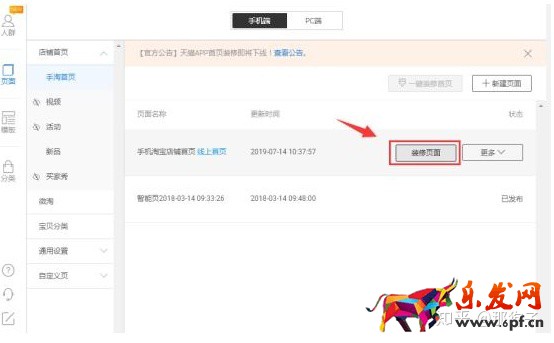 2.進入后選擇點擊【手機端裝修】-鼠標放首頁里,點擊【裝修頁面】。