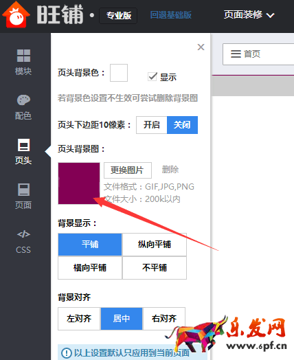 進入編輯狀態。因為框架是支持950的,所以直接把圖片上傳的話,系統就會自動壓縮成950.而要做1920的就要用到css代碼了。