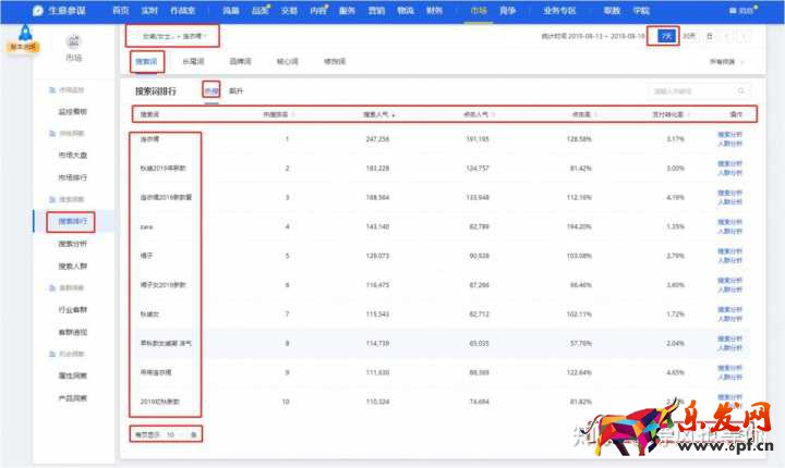 我們一般通過生意參謀中,市場洞察里面的行業排行去搜集,在這個搜索排行里面,我們可以看到搜索排行當中某個類目下的熱搜關鍵詞,我們通???ldquo;7天”的數據。這個地方可以告訴我們買家搜索哪些詞的時候點擊了這個類目的商品。