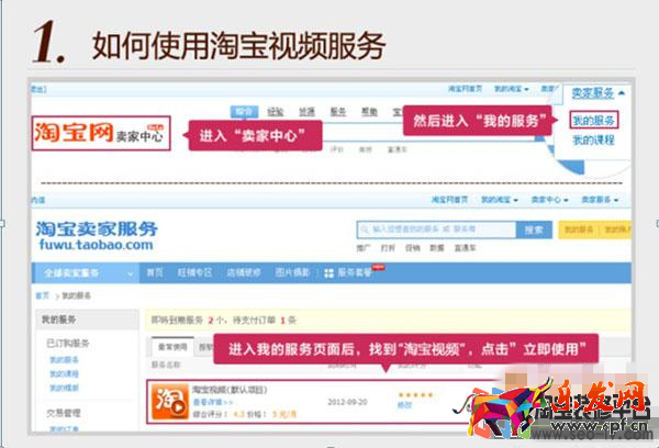 (1)第一,點擊淘寶首頁頂部“賣家中心”選項,在右上角“賣家服務”選擇“我的服務”;第二,選擇“淘寶視頻”的標識,點擊進入上傳視頻的頁面(如下圖)。