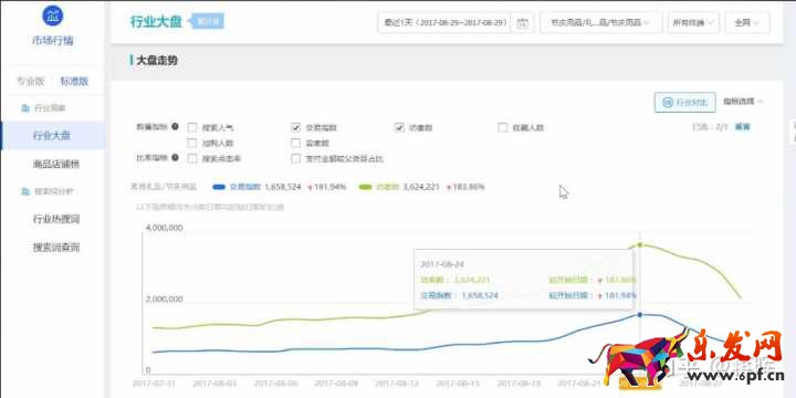 我們打開生意參謀→市場行情→行業洞察→行業大盤→勾選訪客數和交易指數