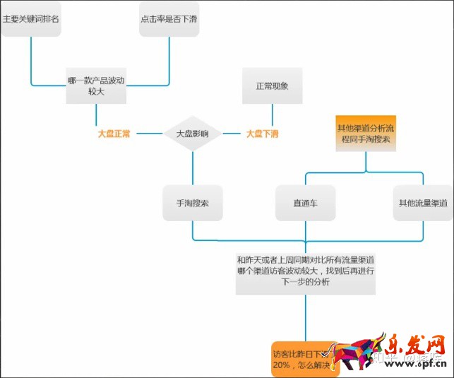 從圖中我們可以確定是哪一個流量渠道下滑比較多,有可能是手淘搜索,有可能是直通車也有可能像手淘首頁其他的流量渠道,這里我們做一個簡化處理,認為是手淘搜索有明顯下滑。