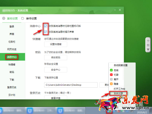 5 同時,在【系統設置】勾選【消息中心】中的提醒,如圖所示。