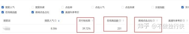 某藍海類目的關鍵詞數據,在線商品數只有200多個,支付轉化率高,而且商城點擊占比低。