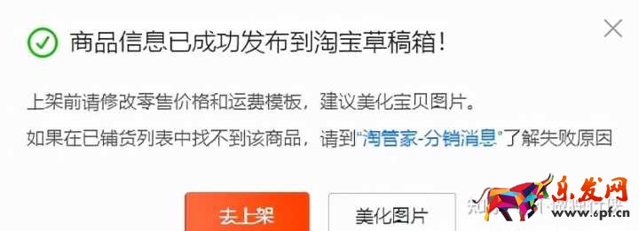 在產品頁面點擊“我要鋪貨”,然后選擇“官方淘寶鋪貨工具”,成功后會提示“商品信息已成功發布到淘寶草稿箱!”這個時候我們再點擊“去上架”,就可以在淘管家頁面看到我們代銷的商品了,然后我們再點擊淘管家頁面的上架按鈕就會跳轉到商品發布頁面。
