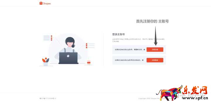 跳轉下一頁:點擊注冊蝦皮主賬號,注意注冊完畢一定要記下來,之前太多學員注冊后就給忘記 了,主賬號相當于你的銀行卡賬號,千萬別小覷了!(如果之前有注冊直接登錄就好!)