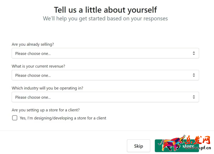 4、店鋪創建成功之后,Shopify會做幾項簡單的調查,問你是否開過店,你現在的營業額s多少等等,你按照你的實際情況填就好了。問卷調查如實填寫有助于Shopify給你推送一些相關的學習資料。
