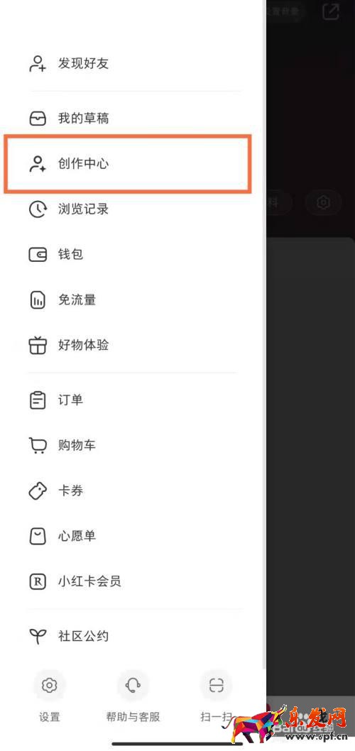 1 開啟小紅書軟件,點擊左上方三條線的圖標,找到創作中心(如圖所示)。