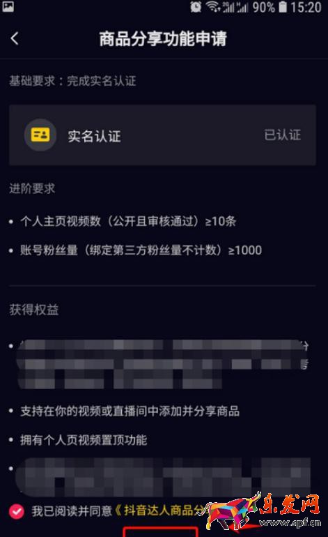 5.在商品分享功能限權的申請頁面,要做的第一步是要完成實名認證,然后查看你是否能夠滿足下面的進階要求,隨后點擊【立即申請】就可以開通抖音櫥窗了。