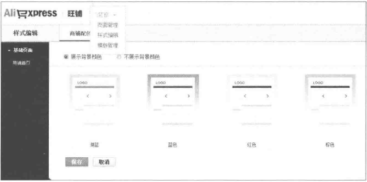 我們了解一下基礎模塊。進入裝修界面,將鼠標移動到左上角的“裝修”按鈕,選擇“樣式編輯”。在這里我們看到有四種配色樣式可供我們選擇。在裝修旺鋪之前,我們首先要從整體上去設定-一個主色調,基礎模塊之中,只有四個色調樣式可供選擇,分別是:湖藍、藍色、紅色和棕色,我們可以選擇任意一種,選好后點擊保存。
