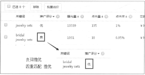 另外一個影響曝光的因素是關鍵詞推廣評分。如果推廣評分為“優”,表示有資格進入搜索結果首頁右側位置;如果推廣評分為“良”,即使出價再高也沒有資格進入搜索結果首頁右側位置。而且在相同出價情況下,優詞比良詞位置更靠前。因此,優化關鍵詞推廣評分,是提高曝光的因素。