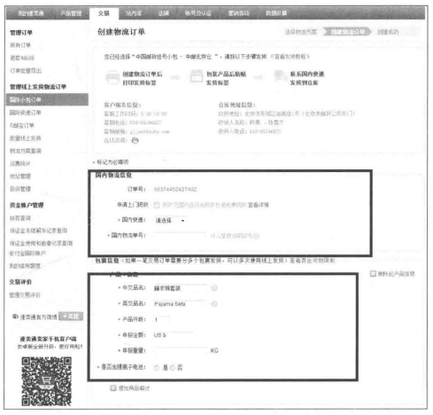 所示。國內物流信息指賣家將包裹寄送至收貨地址所使用的物流信息,符合攬收范圍及免費攬收標準的包裹允許申請上門攬收,僅需補充攬收信息,包括中文姓名、電話、郵編、地址。包裹信息指發貨產品的報關信息,包括產品中文名、英文名、產品件數、申報金額、申報重量及是否含鋰電池。