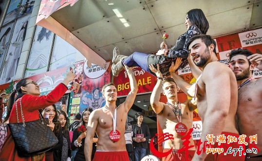 昨天的廣州仍處低溫天氣,但百名型男的激情“肌肉秀”讓這個打折季變得火熱起來,20名外國男模特瞬間成為了全場焦點?;顒又鬓k方“貼心”安排型男與顧客充分互動,一名年輕女顧客最有艷福,獲多名型男溫柔地拋起,吸引一眾師奶驚聲尖叫。