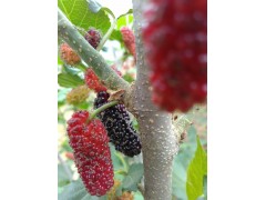 果桑市場發展前景廣闊,我國大部分地區都可種植。該品種樹形開張,枝條細長,花果極多,果實較大,圓筒形,最大果重16克。果實成熟后由紫紅色到紫黑色,果面光澤性強,顏色鮮艷,光亮美觀,象黑珍珠一樣??诟懈侍鹚?。葉片可養蠶或炒茶,果實可加工成罐頭、果汁、酒、茶、還可以加入酸奶中,應用廣泛,速凍果和加工品市場出口前景廣闊。該樹種適應性廣,抗性強、生長快,結果早,效益好,果實美觀,采摘期長,是當前建設生態采摘園的首選品種,也是山區丘陵地區最有發展前景的致富項目之一。